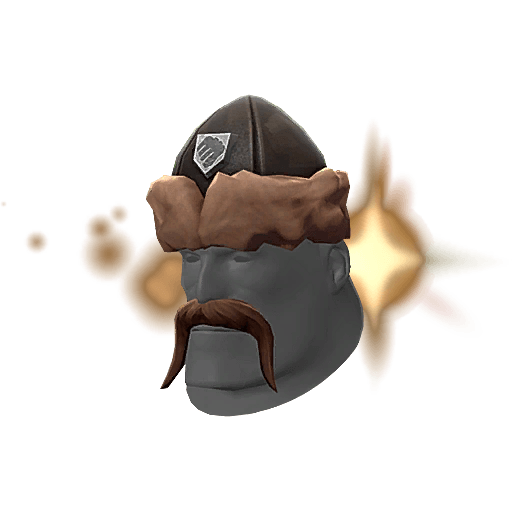 This item features a rugged ushanka-style hat with a fur trim and a metallic badge on the front. It comes with a thick, bushy mustache, giving a distinctly Eastern European military look. The festive effect adds a dynamic, star-like explosion with bright colors behind the head, making the appearance more eye-catching.