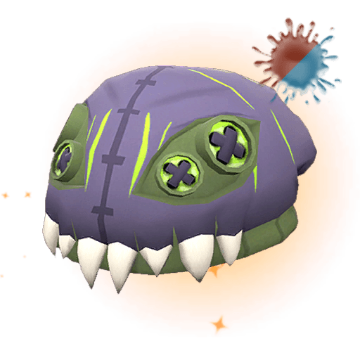 This beanie features a monstrous design with a stitched, purple exterior and large, jagged white teeth along the brim. Two button-like eyes with green highlights give it a spooky, animated look. The overall appearance resembles a gnawing creature perched atop the wearer’s head.