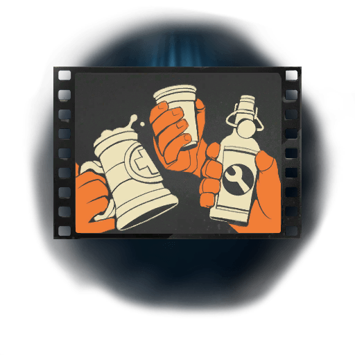 This taunt features a stylized film strip with three hands raising different drinks in a celebratory toast. Each hand holds a unique beverage container, including a stein, a bottle, and a mug, each marked with class-specific symbols. The background is a simple, dark tone, making the orange gloves and white drinkware stand out prominently.