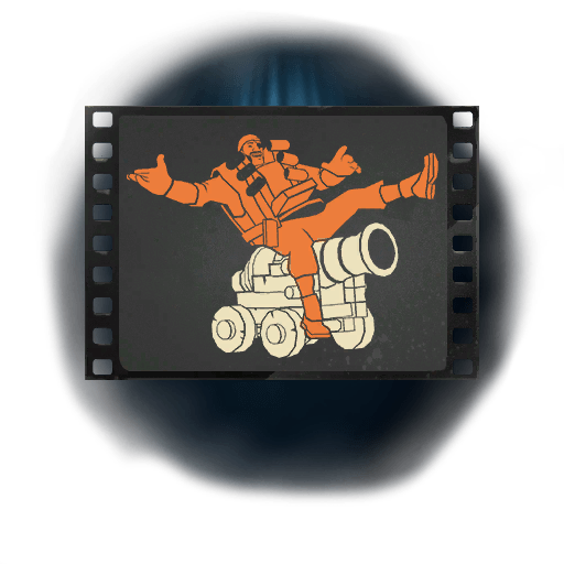 This taunt features the Demoman riding atop a rolling cannon, striking a carefree and exuberant pose. The animation captures a sense of wild, unrestrained fun, with the Demoman's arms flung wide and one leg kicked up.