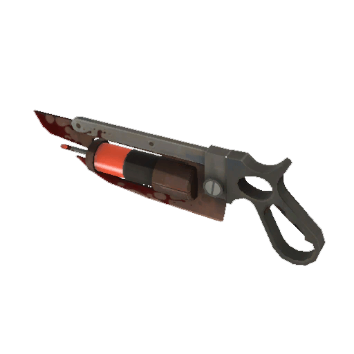 This is a large, serrated surgical saw with a distinctive handle and a blood-stained blade. Attached to the side is a visible syringe filled with a red liquid, giving it a mechanical and medical appearance.